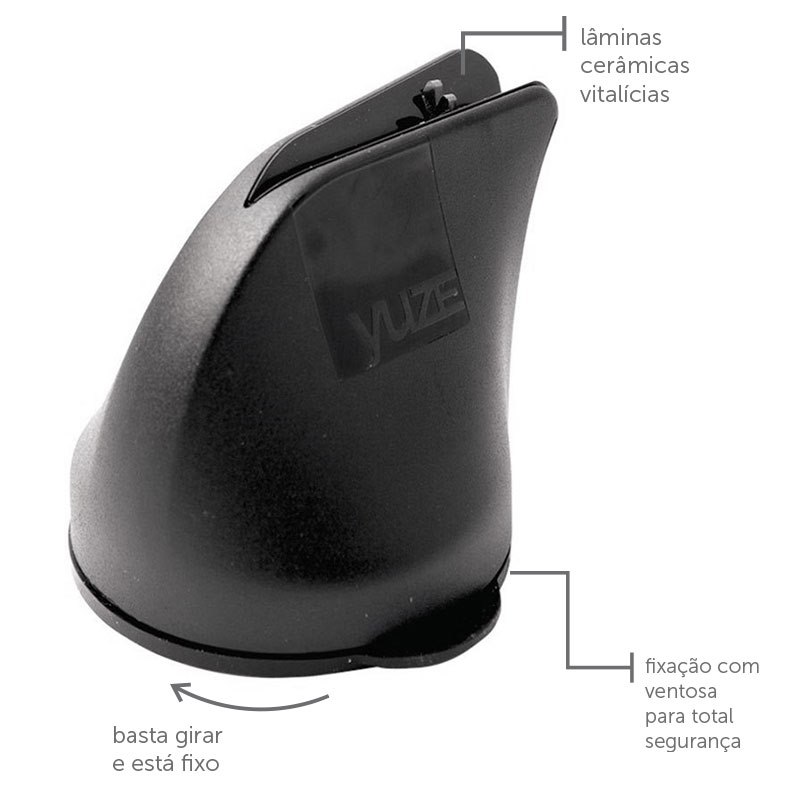 • Uma faca bem afiada é utensílio indispensável na cozinha! Melhor ainda se o afiador for muito fácil de usar. Com o yuze afiador você afia suas facas de maneira prática e muito segura. Ele tem um sistema de fixação por ventosa que o mantém fixo à superfície da sua bancada e possui lâminas de carbeto de tungstênio, que garantem uma afiação precisa com uma angulação permanente de 20 graus. É o fim das facas sem corte da sua casa!